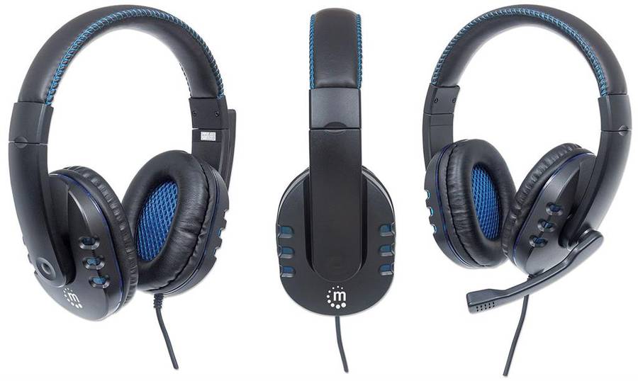 Manhattan USB Gaming Headset with LEDs - For PC, PS3 & PS4, Retractable Built-in Microphone, Audio Control Function, Integrated 1.8 m (5.9 ft.) USB Cable, Black and Blue, Retail Box , 1 year Limited Warranty