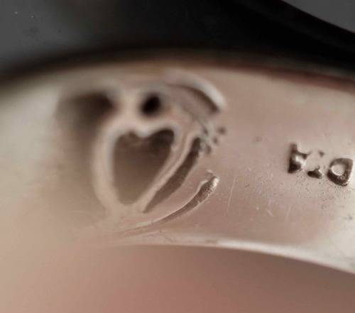 This vintage man's wedding ring is a vintage piece from Birmingham, the Jewellery quarter of England. It is a little over 5mm in width. Its a big ring size (11 - or V/half in British sizing) and weighs 3,79 grams. The shank is plain all the way round except for an unexpected design feature on the 'front' of the ring. The jeweller has created an engraved groove at a slight angle, into which he has set four small diamonds. The jeweller has created four small openings on the inside of the ring where the diamonds are set to allow for light. The diamond touch is subtle - manly rather than feminine bling! It is a vintage piece and there are definitely buff marks on the gold to speak of its age. Although definitely a man's ring in design, a woman might find it appealing as a thumb ring or if you fingers are big enough to cope with the large size, would make a great stacking ring. Its a fun fashion trick to stack plain solid gold wedding bands - particularly men's rings - on one finger. There are lots of hallmarks including include 375 for 9 carat gold, the jeweller's signature, DIA for authenticated diamonds and the Birmingham assay hallmark. In addition there is what I imagine was a personal engraving done years ago saying "Karen". It would be easy enough to have a jeweller remove the name and create a plain finish there. One feature I find really fascinating is that hidden on the inside of the shank is a heart shape, fashioned in relief, but quite invisible on the outside of the ring! (See photograph above.)