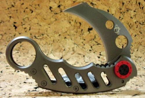 Mantis Knives - Karambit Linerlock Knife with Red Trim. Model: MANMK2. 4 5/8in. closed linerlock. 420HC stainless modified tanto blade with thumb hole pull. 420 J2 stainless frame with finger ring. Both blade and frame have a non-glare black finish. Frame has red trim and stainless pocket clip. Country of Origin: TAIWAN
