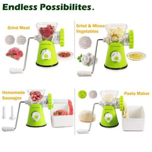With the Kitchen Meat Grinder / Sausage Stuffer / Pasta Maker the possibilities are endless. Use it for grinding meat, vegetables, garlic, beans or garlic. It features an ergonomic and easy to turn handle. Just insert your meat, vegetables, etc. and grind it quickly and effortlessly. Grind beef for beautiful and delicious homemade hamburgers and sausages. Crush nuts, garlic vegetables, etc. Can also be used to finely mince or purée vegetables for baby food
