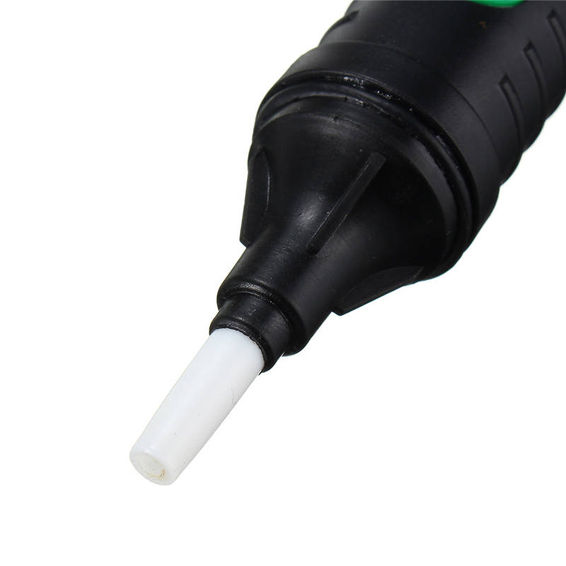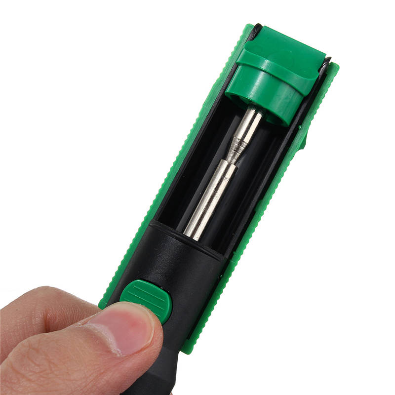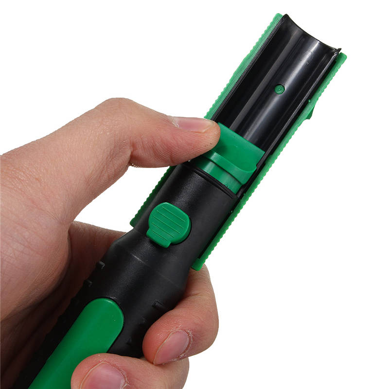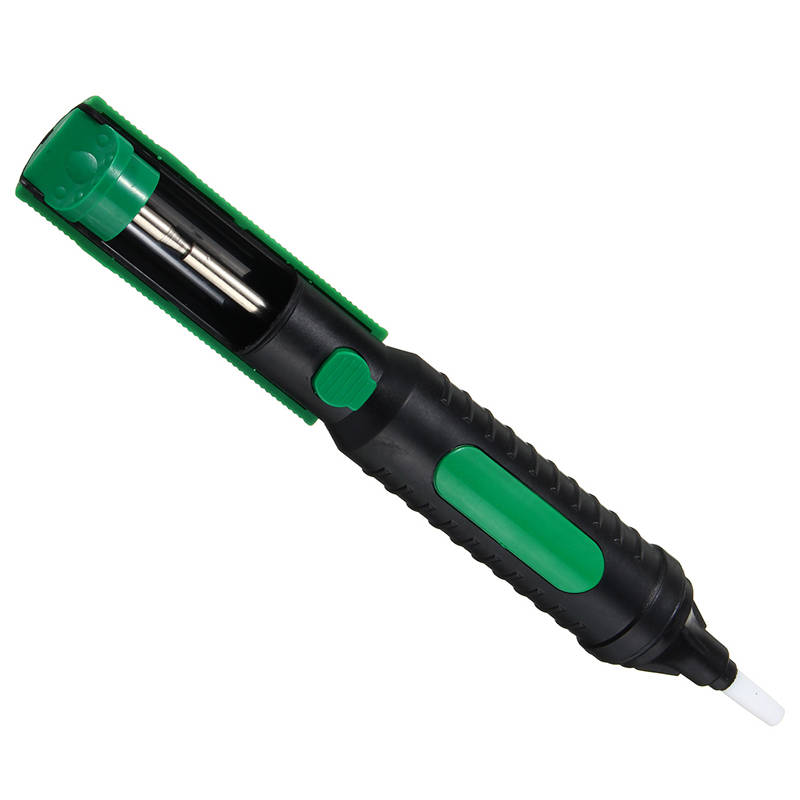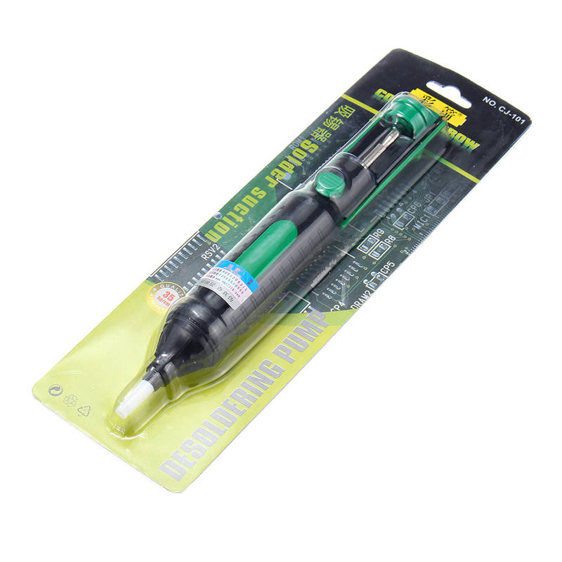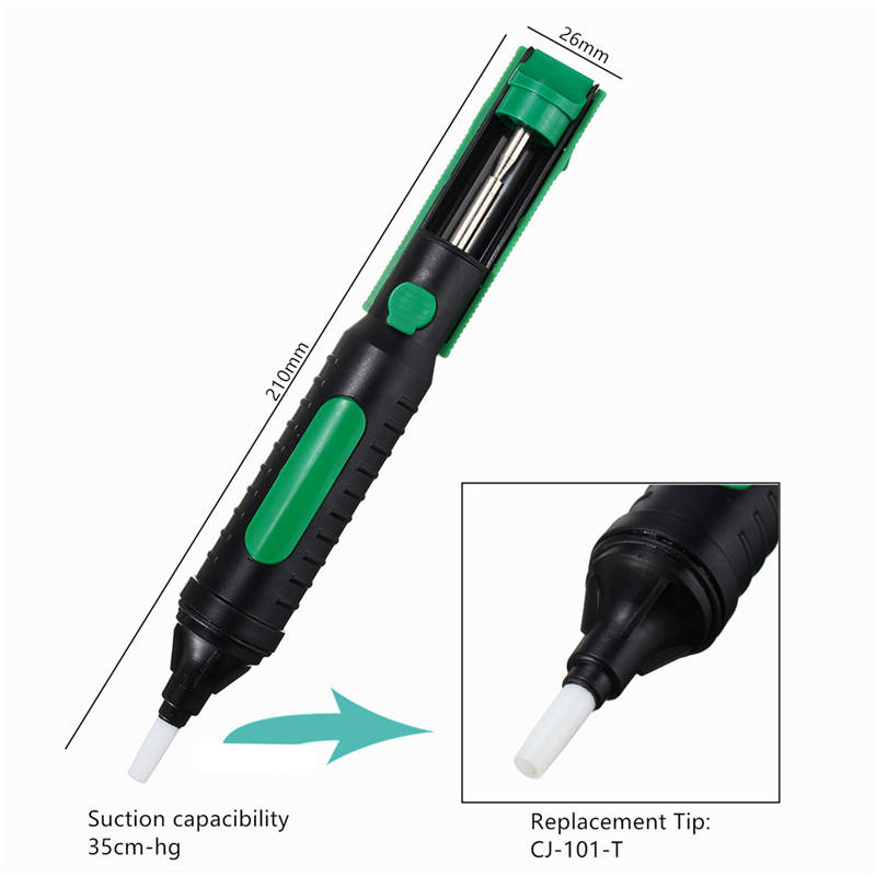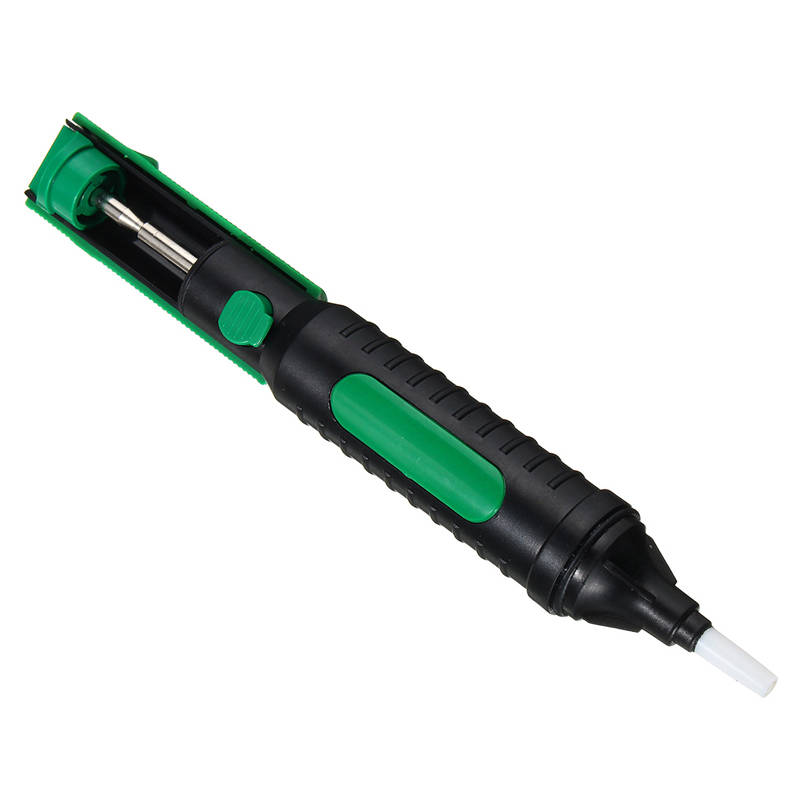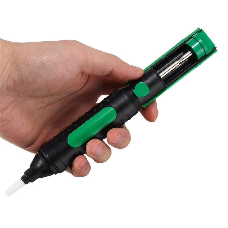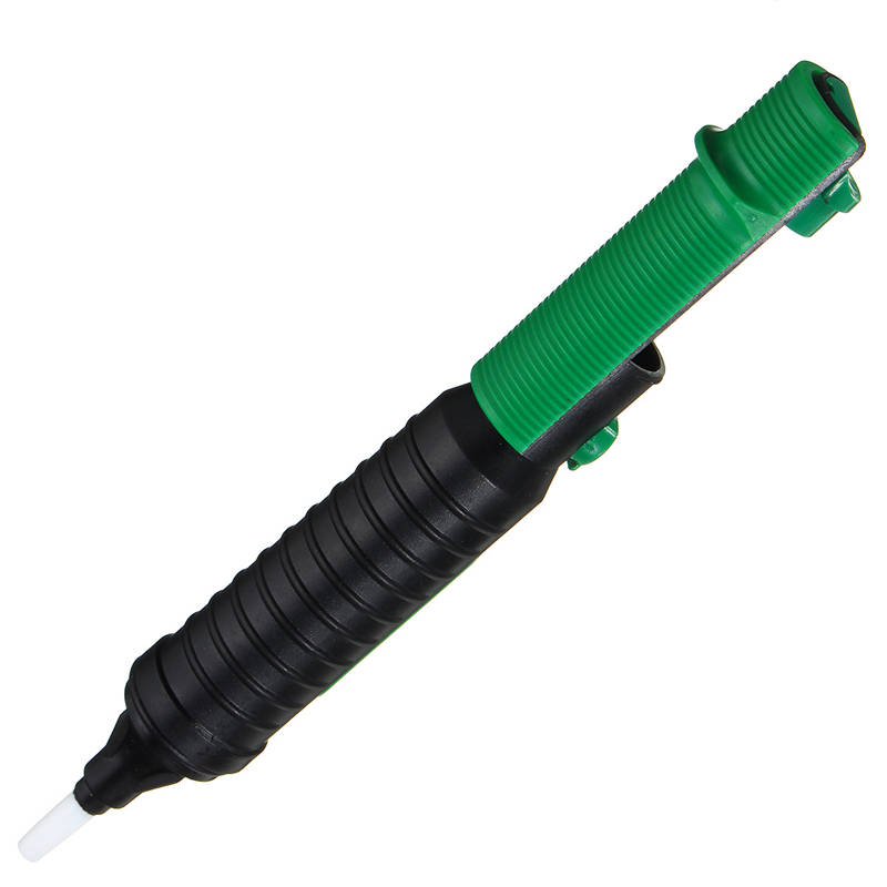 Color: Green + Black Material: Stainless Steel, Plastic Item Size: Approx. 21 x 2.6cm Weight: 83g How to use: 1.Push Set-knob for loading until the knob stops 2.Melt the solder with an iron where it is intend to remove 3.Please aim the nozzle to melted solder and push release button