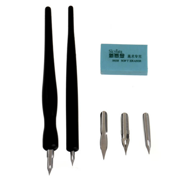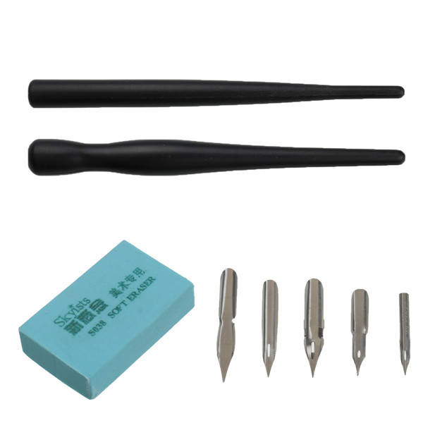 Description: 1. Material: Plastic 2. Pen handle: Small round dysprosium 3. Pen Size: 12 x1 cm 4. Rubber Size: 3.5x2.2x1cm 5. Color: Black Features: 1. This set of nibs and pen holders is ideal for cartoonists and artists looking to create fine line, lithography, cross-hatching, alphabets, and uniform line drawings. 2. Develop your skills and express your ideas through beautiful designs Package Included: 5 x Five Silvery Nibs 2 x Black Pen Handles 1 x Blue Drawing Rubber
