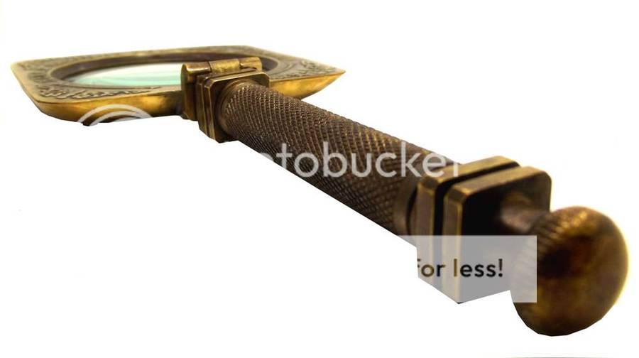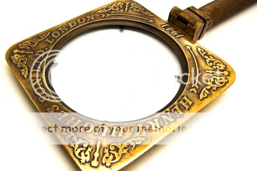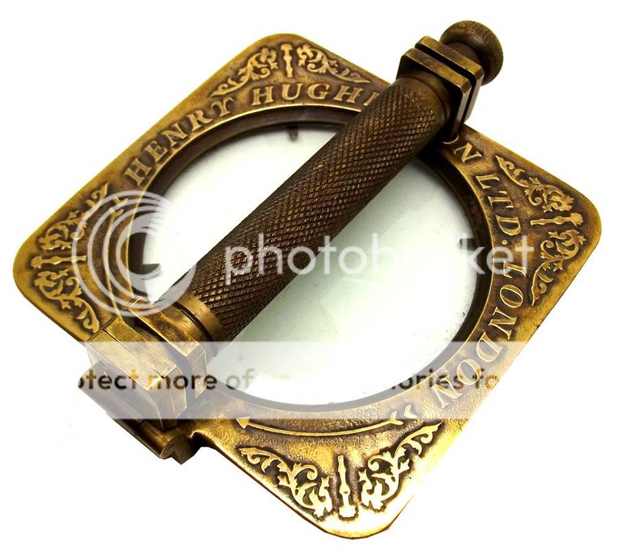 GORGEOUS ANTIQUATED BRASS SOLID BRASS MAGNIFYING GLASS, 20 CM LONG WITH A LARGE 25X MAGNIFICATION POWER. LIMITED EDITION RE-CREATION, SHIPS IN A WONDERFUL HORSE-LEATHER CASE WITH BRASS ACCENTS.
