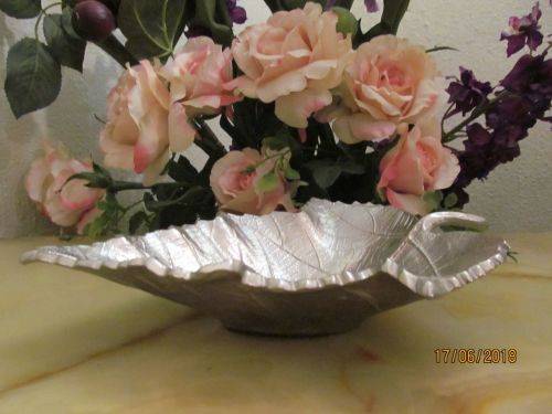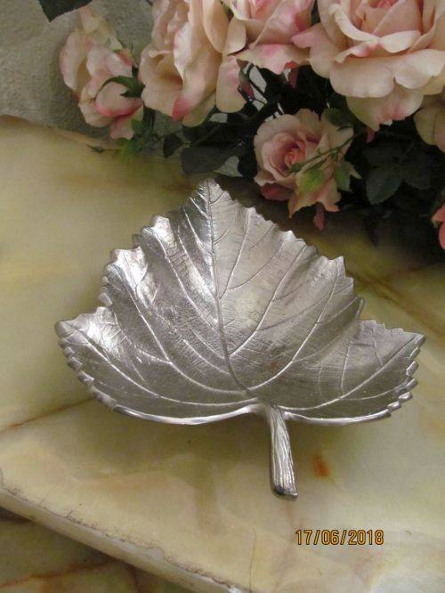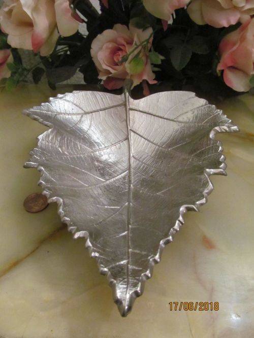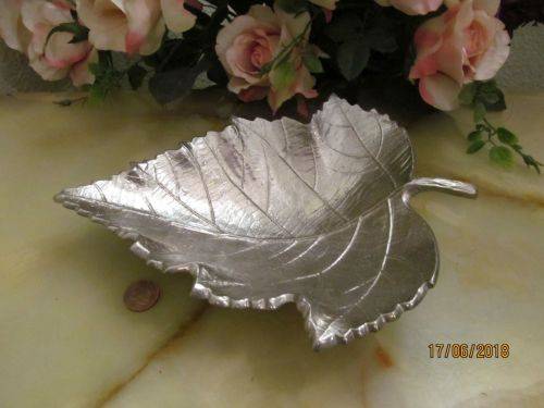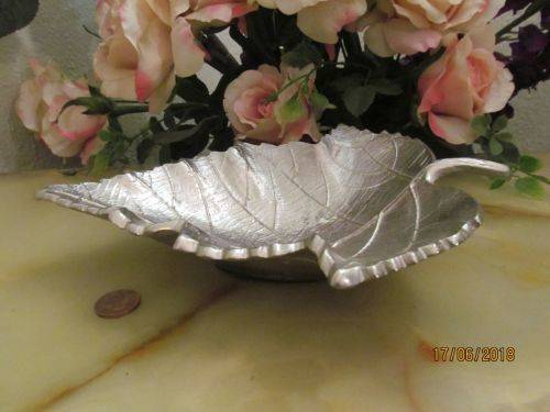 LARGER THAN AN AVERAGE SWEETS / BON BON DISH, THIS ENTICING DECORATIVE ITEM IS MANUFACTURED FROM NICKEL PLATED ALUMINUM IN THE PERFECT REPLICA OF A MAPLE LEAF AND IS PERFECTLY AND SKILLFULLY DESIGNED WITH ALL THE NATURAL ATTRIBUTES OF A LEAF IN VERY INTRICATE DETAIL. THE DISH IS EXACT IN EVERY DETAIL TO THE "MARTHA STEWART PARK LEAVES COLLECTION" (Pls see link) AND IS A COLLECTABLE DESIGNER SERVING DISH