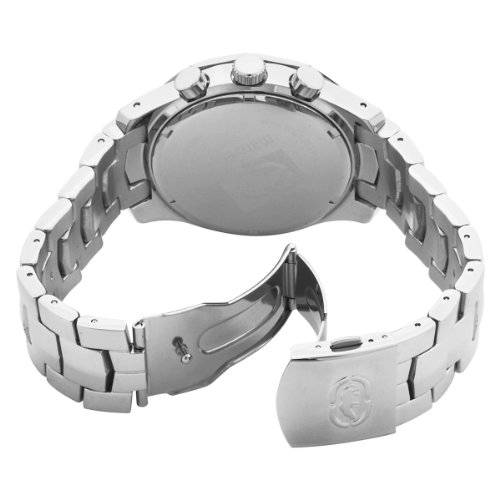 Japanese Quartz movement; Chronograph displaying one-hour and 60-second subdials; Main dial polished silver-tone hour; minute and sweep seconds hands; Subdials displayed by matching hands; Applied and polished silver-tone hour markers and 'Ecko' logo at 9; Black numbers/indices mark subdials while black indices reveal outer minute track; Analog date display positioned at 3; Polished silver-tone bezel encrusted with clear crystals; Round polished silver-tone stainless steel case embellished with crystal accents; Notched and polished crown and polished selector buttons; Stainless steel caseback