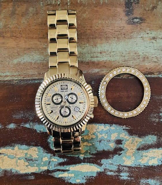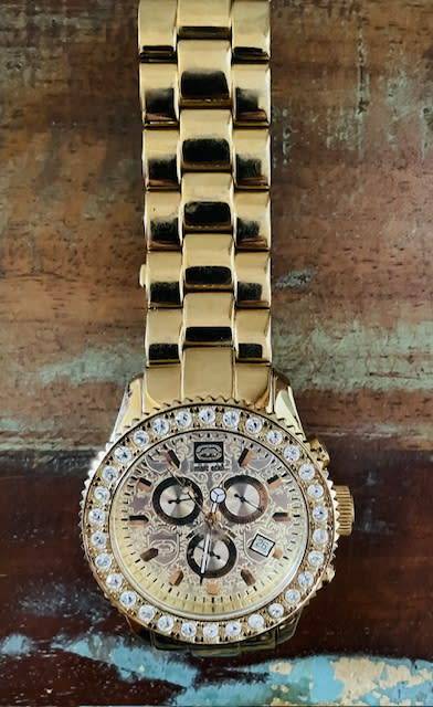 MARC ECKO MENS GOLD PLATED WATCH. THIS IS A STUNNING WATCH. THE WATCH FEAUTURES INTERCHANGABLE CROWNS AND CHANGES THE LOOK OF THE WATCH INSTANTELY WHEN CHANGING THE CROWNS. THE WATCH NEEDS A BATTERY. WHEN THE BATTERY IS REPLACED, THE WATCH WILL TICK. THIS MARC ECKO MENS GOLD PLATED WATCH IS A MUST HAVE. PLEASE NOTE THAT THERE IS NO WATCH BOX INCLUDED.