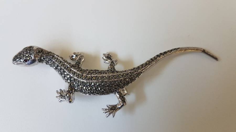 This little guy is 95 mm long and 35 mm wide. Very beautiful brooch. I don't know what metal he is made of.