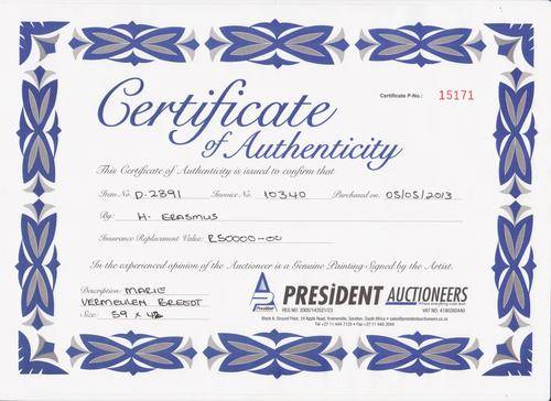 Mari Vermeulen Breedt Investment art. Painting is framed. Size: 85 x 65 (with frame) and 59 x 42 (without frame). Valued at R50 000 in 2013. Certificate of authenticity included. Buyer need to arrange and pay for courier or own transport. Seller can't be held responsible for damages that may occur during transport.