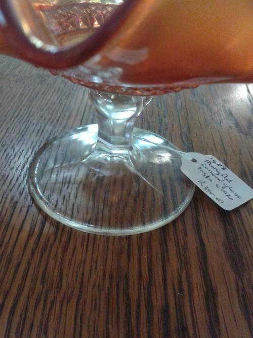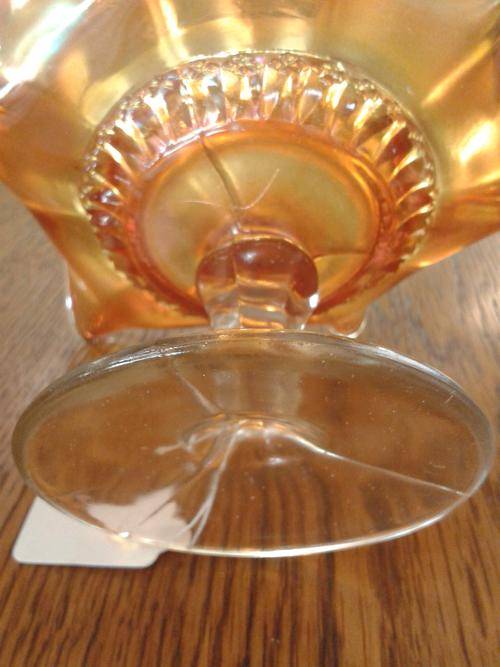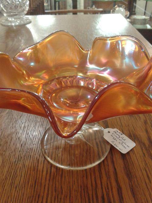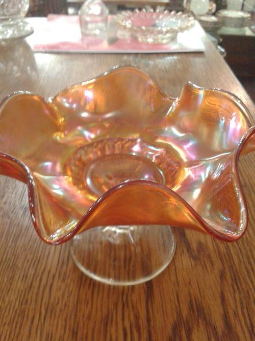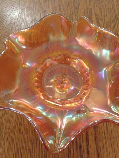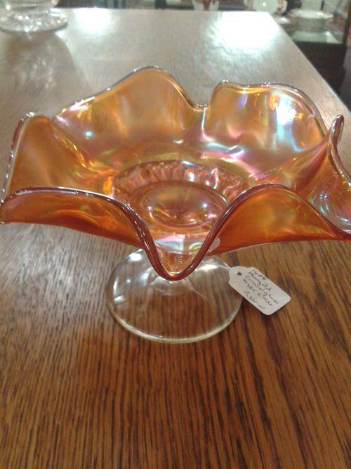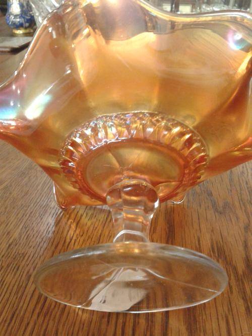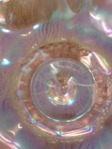 This is a wonderful vintage carnival glass Tazza. The shimmering colors in the center of the bowl are quite vibrant. This would make a wonderful candy bowl, or just a nice piece of decorative glass. Add it to your carnival glass collection today!