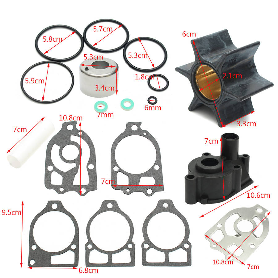Description: This kit fits for Mercury Mercruiser Alpha 1.? It includes the impeller, wear plate, gaskets, o-rings and others needed to service your water pump.? If your pump housing and base are in good condition this is a economical way to service the water pump ? Specification: Material: Rubber + metal Diameter: Approx. 6cm/ 2.36 Number of Blades: 6 This replace part number: 46-96148T8 ? Fitment: This part suits the following engines: 48-96148A1 Housing 32435 Wear Plate 23-29804 Guide Tube 25-30271 Slinger 27-85608-1 Gasket 27-858524 Gasket 27-32438 Gasket 27-856704 Gasket 27-42631-1 Gasket 12-20260 Gasket (2) 25-30613 O-Ring 25-90011 O-Ring 25-30225 O-Ring 25-33145 O-Ring 26-45577-1 Seal 47-89984T4 Impeller ? Package Included: 1 X Water Impeller Pump Kit
