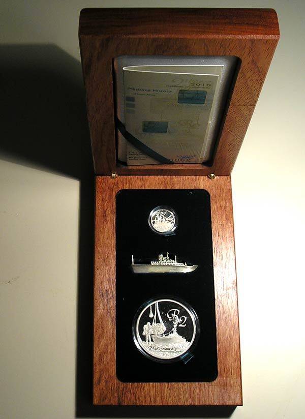 Maritime History of South Africa, 2010 Mail Steamships. Proof Silver Tickey and Crown with Model of Ship in Silver. Comes in a wooden presentation case with certificate (0062 of a maximum mintage of 700).