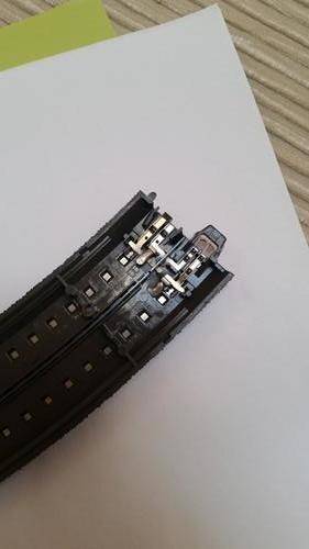 condition: used, some minor paint marks, track mounting holes drilled out, solder on contact points under track, still work perfectly and clip together fine.