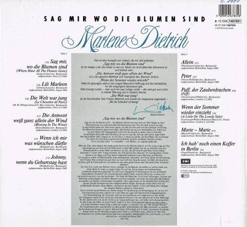 Hard to find 1983 German EMI pressing, release number 1C 028 1467831, of compilation album by MARLENE DIETRICH: Sag mir wo die Blumen sind. The track details are as shown on the images provided. The record is in a practically unplayed, near mint condition. The cover has very slightly scuffed corners and edges, plus a few light edge crinkles, otherwise in an excellent shape. M- / VG+ |