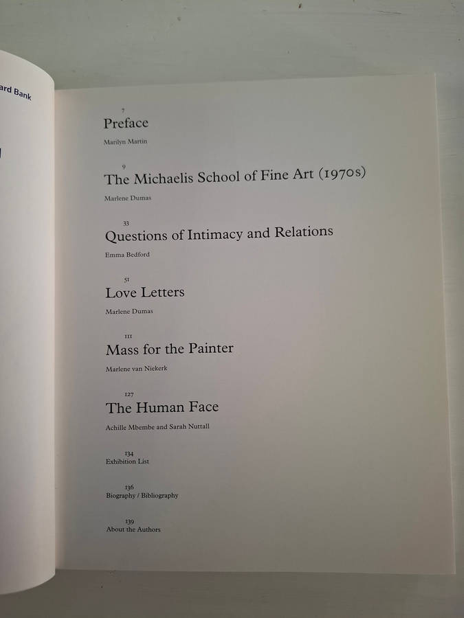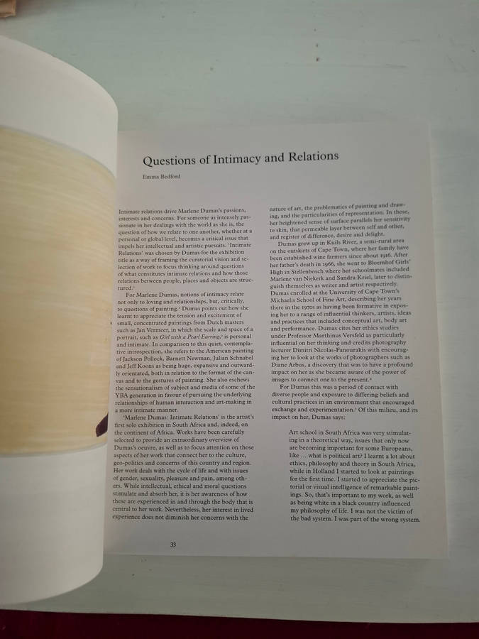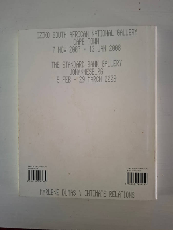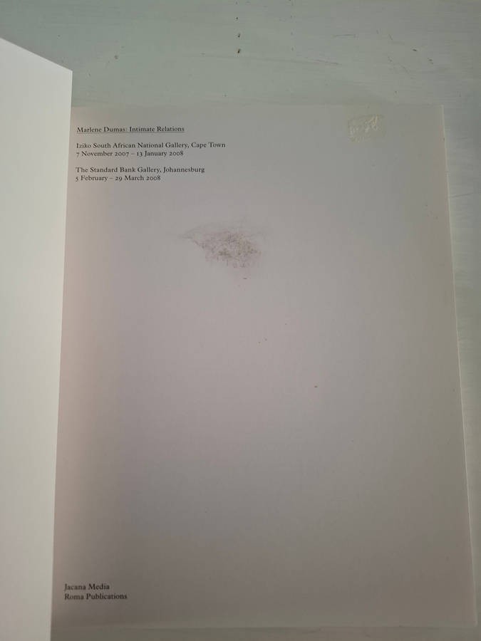 Dumas' first solo show in South Africa after moving to The Netherlands 30 years ago provided occasion for this catalogue. Featured are more than 50 paintings, drawings and prints presented at the exhibition, as well as personal letters, documents and photographs collected by the artist. A selection of the artist's own writings is included, ranging from her unique commentaries on art to aphoristic writings and poetry that are once insightful, witty and thought-provoking.
