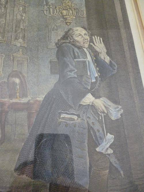 The young nobleman has his father's problems with money. His despairing Methodist steward (he carries a copy of "Regeneration" in his pocket) leaves with a sheaf of bills in one hand and a single one marked "Red'd. June 4, 1744" in the other.