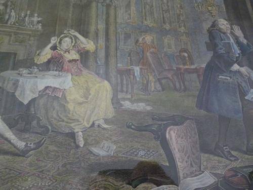 Leading extravagant, vitiated lives, the husband and wife have become completely alienated from each other. It is 1:20 A.M.; they sit apart after a night of independent entertainments. Enervated and listless, the husband slumps back on a chair gazing dejectedly at the floor, unaware of his wife's presence. A dog pulls his mistress' cap from his pocket; before him lies his sword broken in a fight. His wife, stretching gracelessly, vainly attempts to win her husband's attention by her glance and outstretched foot. Her entertainment, much more innocent and middle-class than his aristocratic debauchery, has been to remain at home and entertain guests at cards. "Hoyle on Whist" lies at her feet.