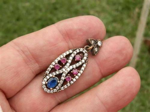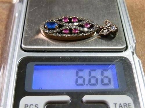 Fabulous sterling silver ruby pendant with clear stone and bronze accent, marked 925 and in new condition.  The size is 14 x 40 mm and the weight is a healthy 6.66 g.  The hardness of the 5 rubies is 9 on MOHS scale.  Splendid!!