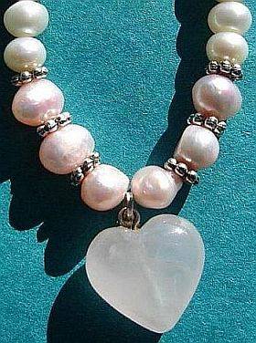Pearls eliminate emotional imbalances and Rose Quartz is the stone of unconditional love and infinite peace. It is the most important crystal for the heart and the heart chakra, teaching the true essence of love. It purifies and opens the heart at all levels, and brings deep inner healing and self-love. It is calming, reassuring, and excellent for use in trauma or crisis. | Facts about freshwater pearls - Natural freshwater pearls occur in mussels for the same reason saltwater pearls occur in oysters. To cultivate a pearl, the farmer slits the the mussel and inserts a small piece of live tissue form another mussel. Foreign matter inside a mussel cannot be expelled. To reduce irritation, the mollusc coats the intruder with the same secretion it uses for shell-building, nacre. | |