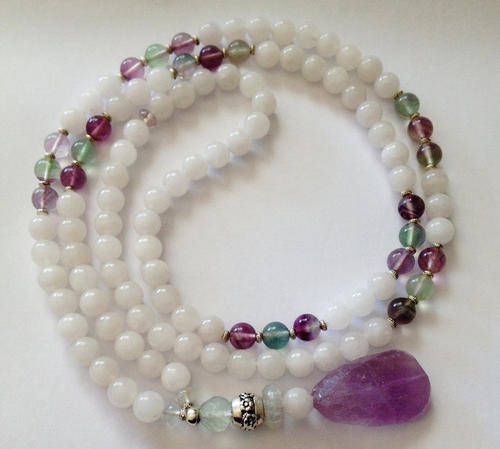 This listing is for a 108 handcrafted bead mala with authentic white jade and rainbow fluorite.