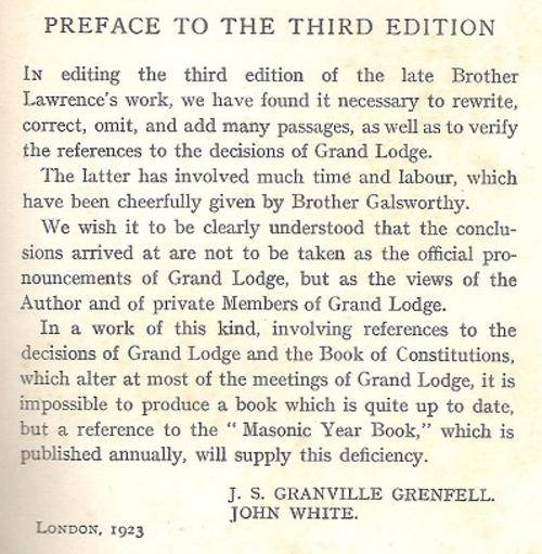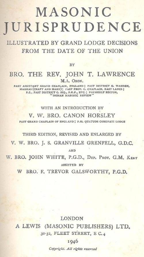 Masonic Jurisprudence - By Bro. The Rev. John T. Lawrence - Third Edition By Bro. J. S. Granville Grenfell