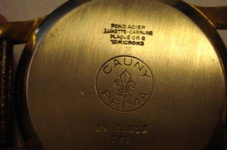 Gold plate watch case in great condition measures 40mm x 40mm (not including lugs and crown). Manual 15 Jewel movement signed Cauny Prima. Snap-on Stainless Steel back signed Cauny.