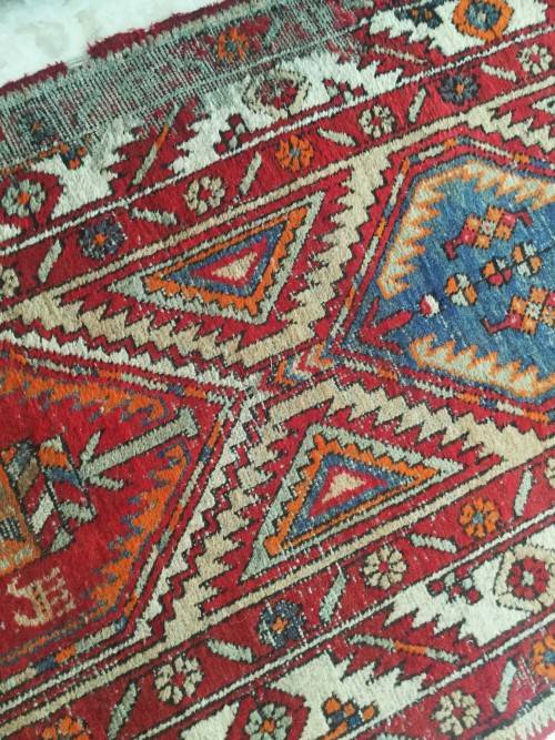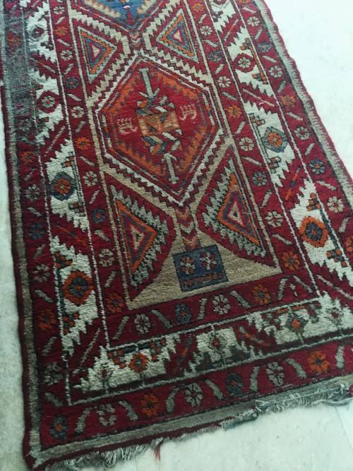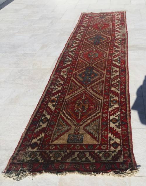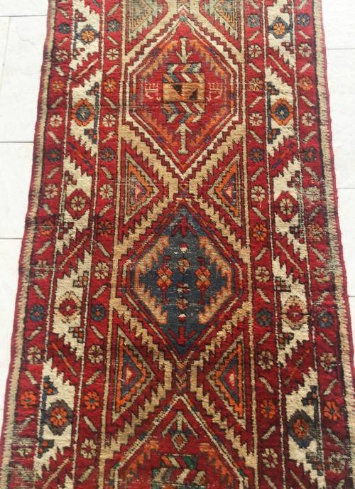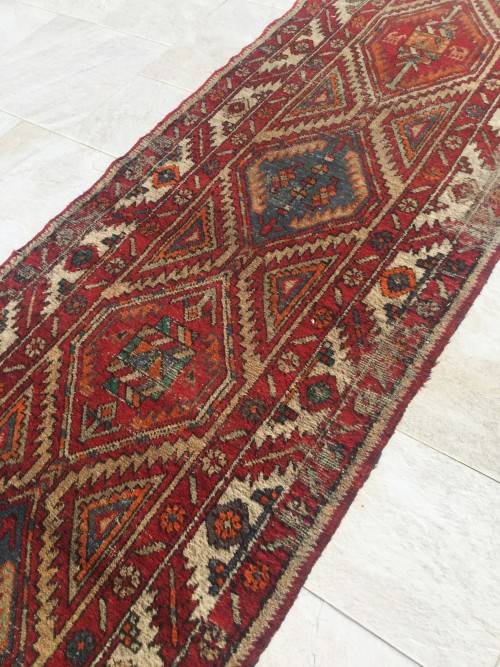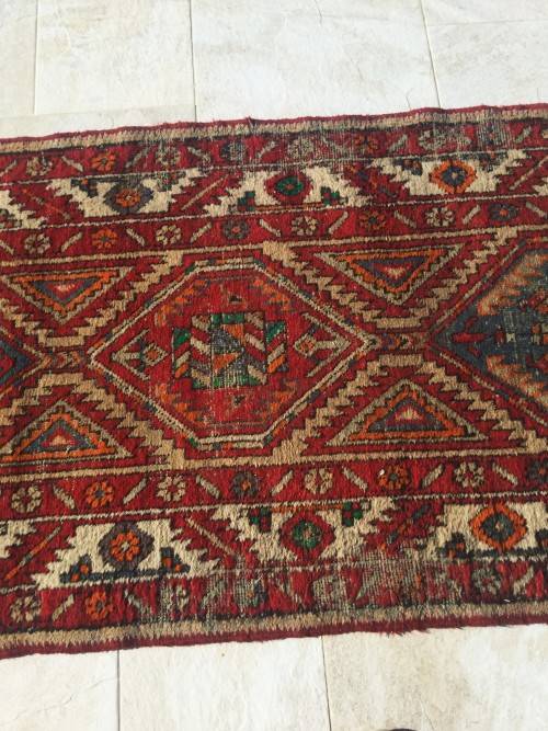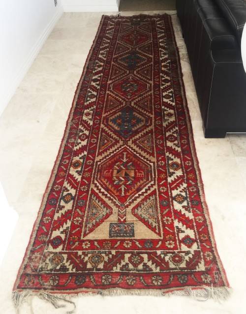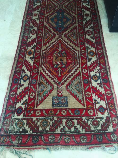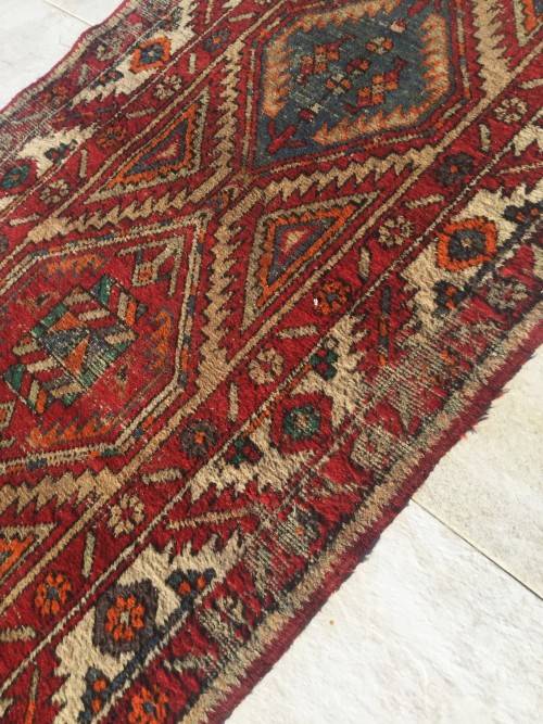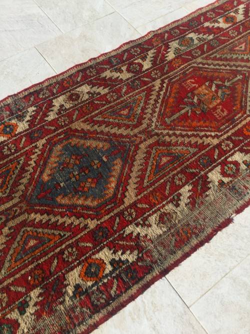 Hi there, I have this great Persian runner, it is slightly worn but it adds to the overall effect of a vintage carpet. The runner is completely hand-knotted with popular red, green and blue colours. The runner is very large measuring 420cm by 98cm! Please see the pictures for the colours and see to the worn bits! Being a second hand carpet please note that it could do with a clean! Secure courier is R150, please only serious bidders, Good Luck!!