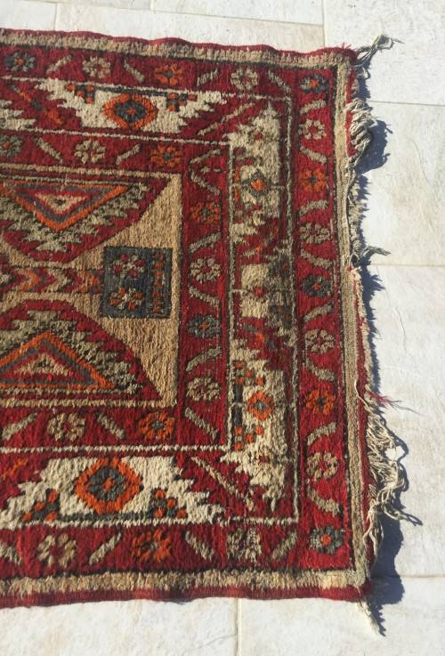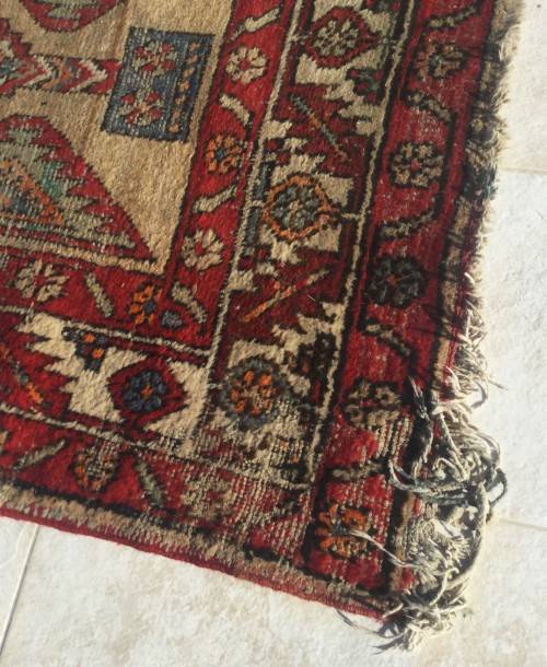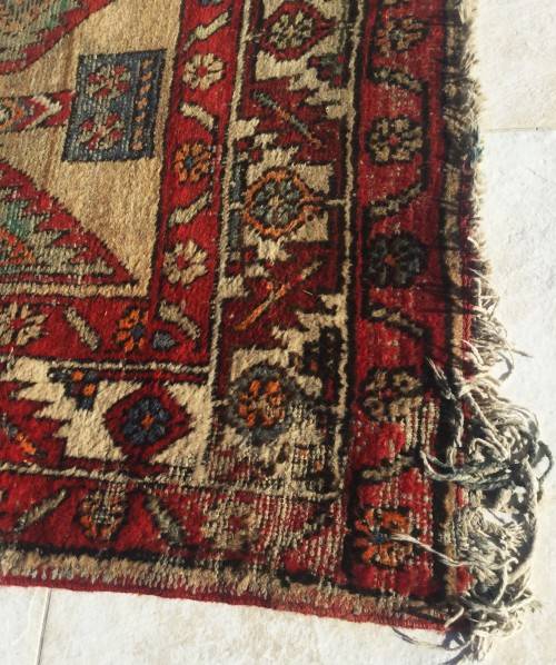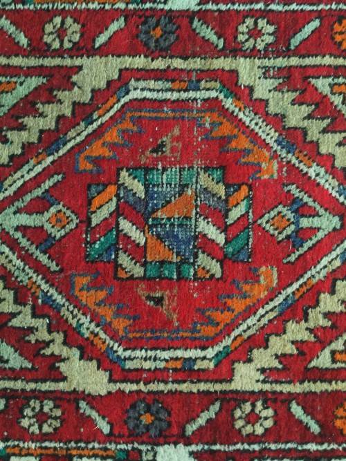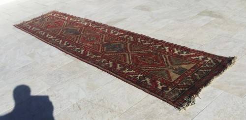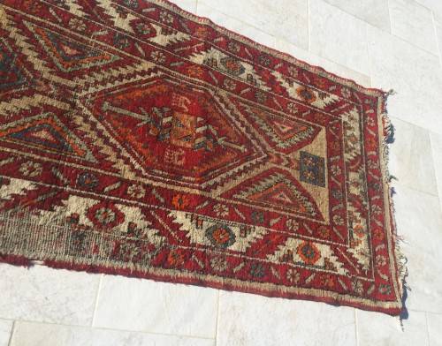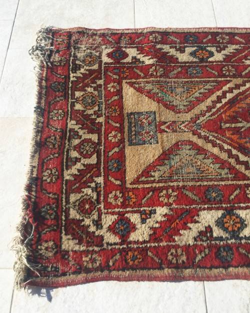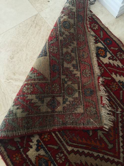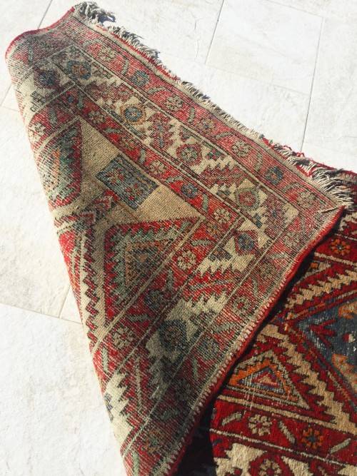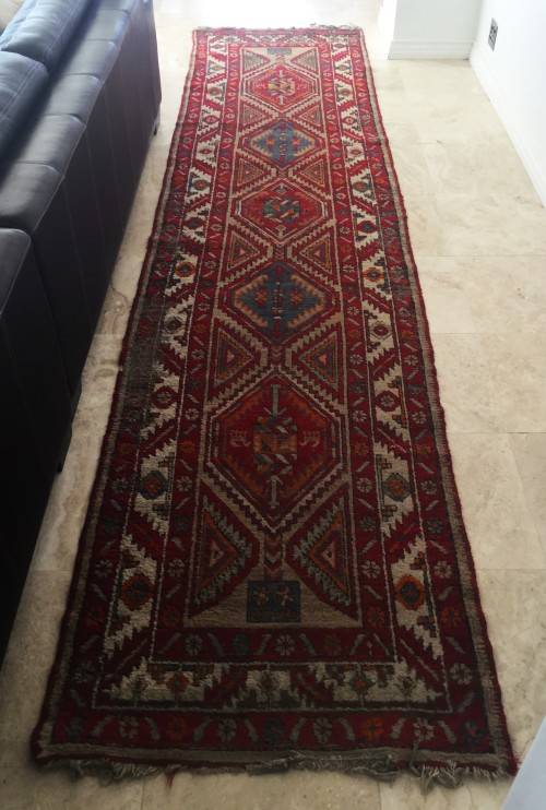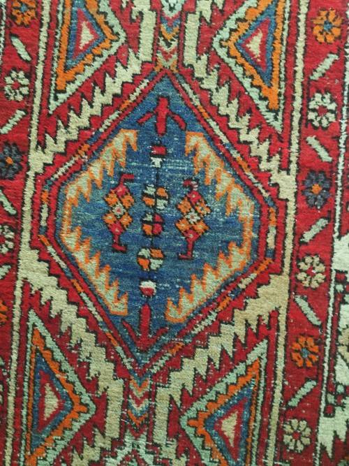 Hi there, I have this great Persian runner, it is slightly worn but it adds to the overall effect of a vintage carpet. The runner is completely hand-knotted with popular red, green and blue colours. The runner is very large measuring 420cm by 98cm! Please see the pictures for the colours and see to the worn bits! Being a second hand carpet please note that it could do with a clean! Secure courier is R150, please only serious bidders, Good Luck!!