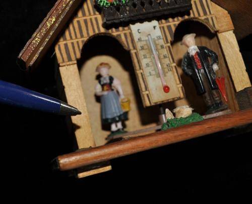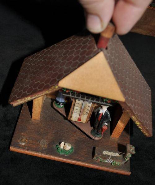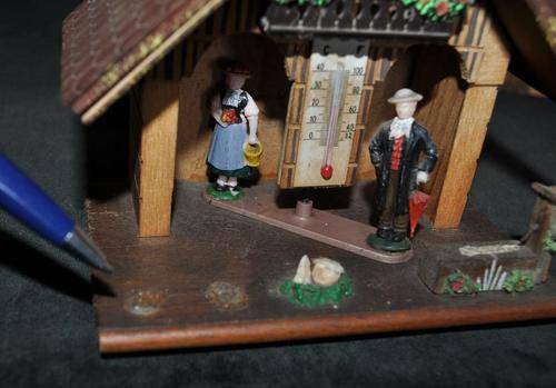 Please note that both items are untested and in need of TLC. The clock is missing the key and the pendulum. The clock work is looking great and is possibly working. The weather station is lacking an ornament in the foreground, the roof layers are separating in places and some of the front cladding is missing. See pictures. Postage R41.