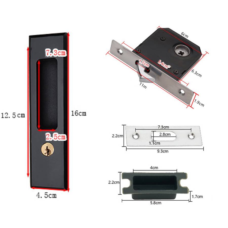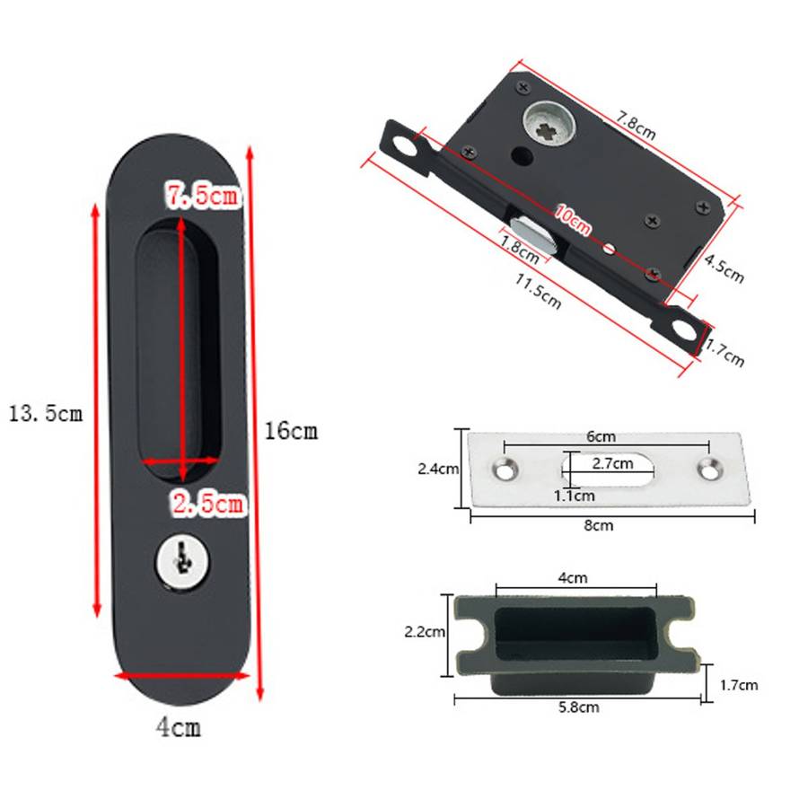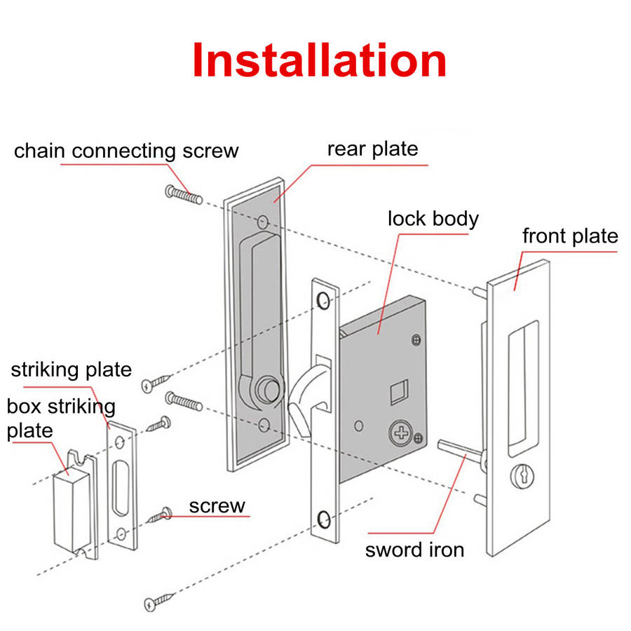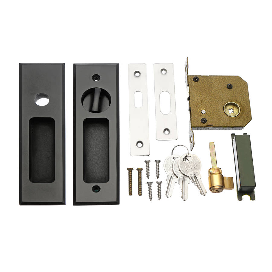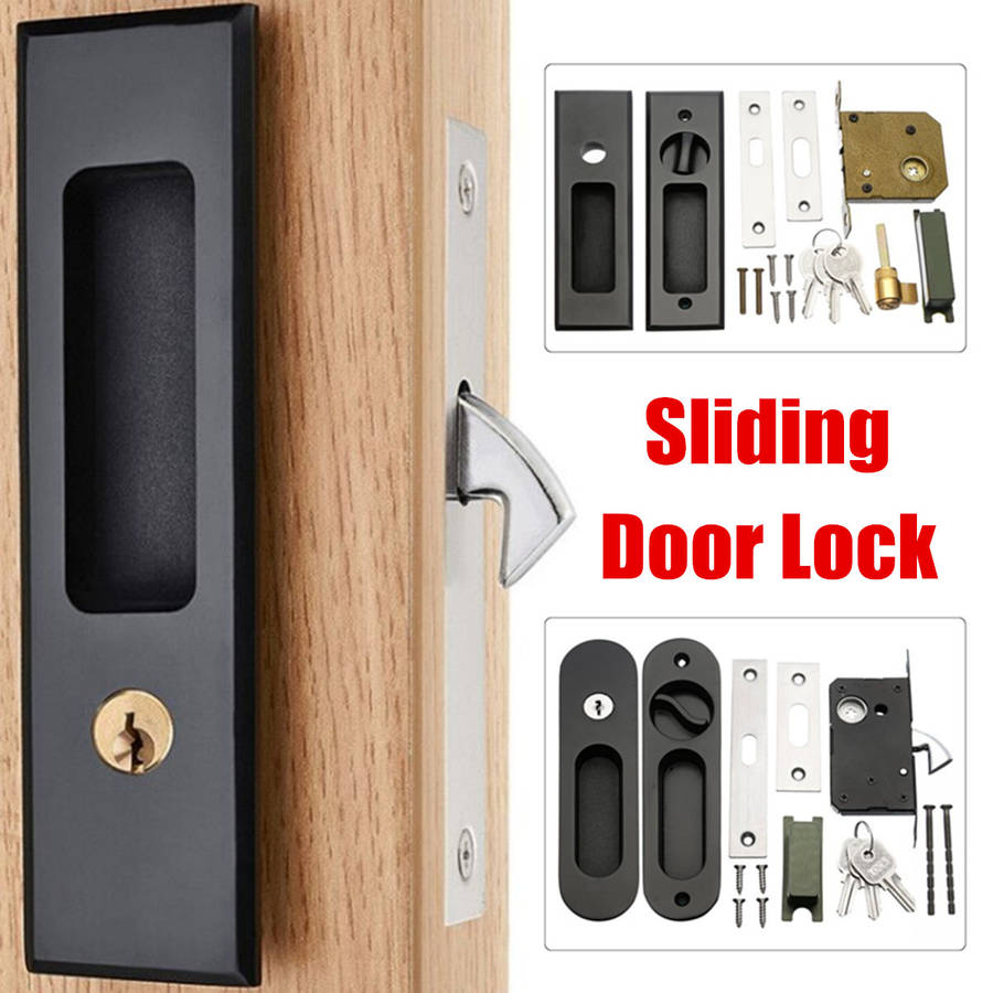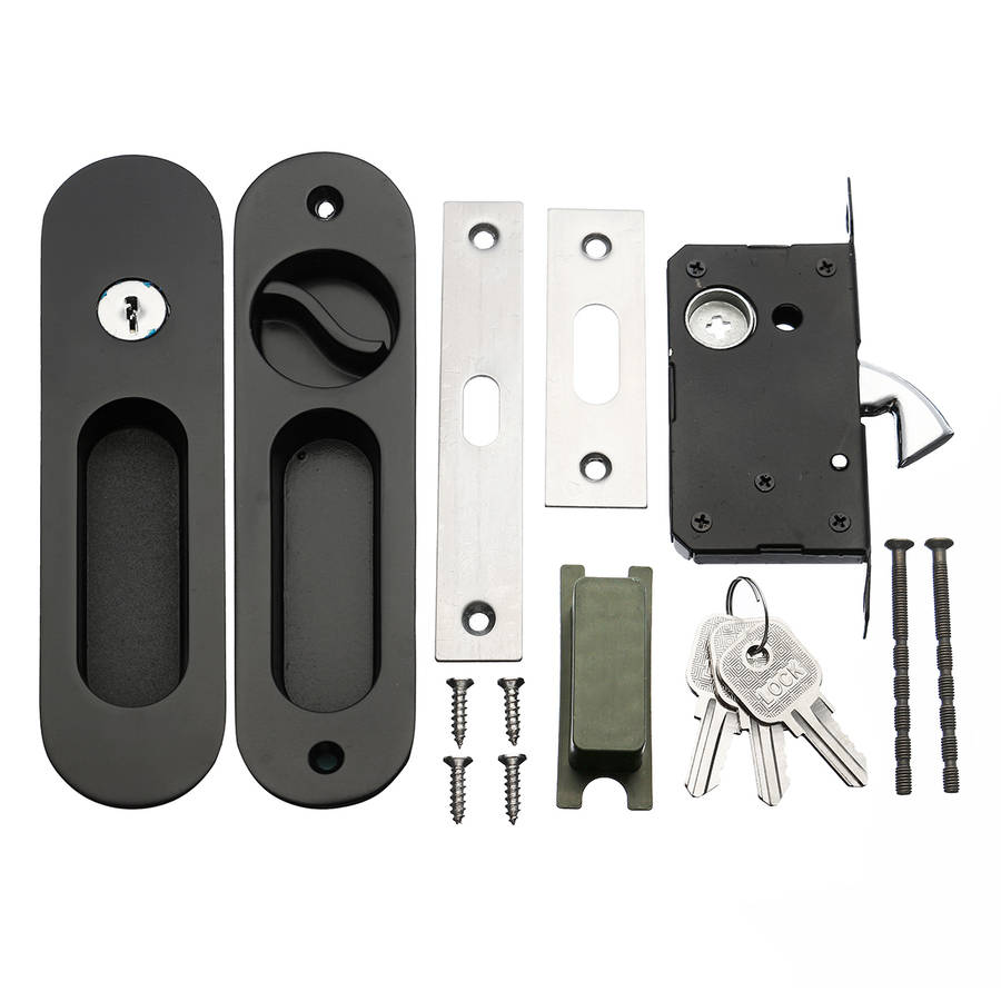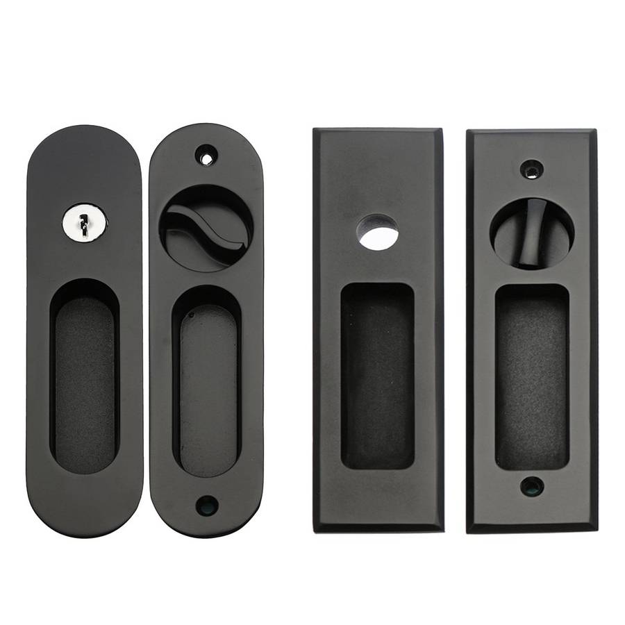Specification: Color: Black Material: Zinc Alloy 2 Pattern: Round / Rectangle Fits Door Thickness: 35mm - 45mm (1 3/8 - 1 3/4) Round Lock Distance: 35mm / 1.38`` Round Faceplate: 160 x 40 mm / 6.30`` x 1.57`` Rectangle Lock Distance: 45mm / 1.77`` Rectangle Faceplate: 160 x 45 mm / 6.30`` x 1.77`` Features: a Zinc alloy construction with matt black finish. a Suitable for both left and right hand sliding doors 35mm to 45mm thick. a Comes with matching colour of mounting screws, a hook lock and hook plate for the door jamb. a Face plates designed to sit flush with door to allow the door to completely slide into the wall cavity. Package Included: 1 x Sliding Door Lock Set
