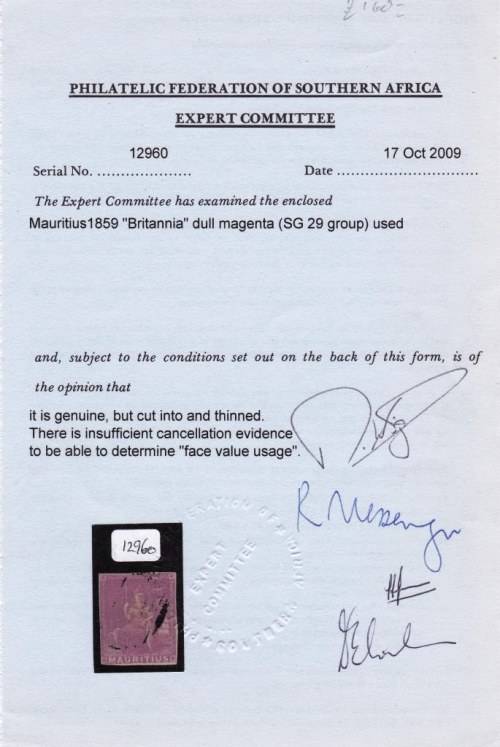 MAURITIUS - 1859 - "BRITANNIA" - DULL MAGENTA (SG29) - USED (WITH CERTIFICATE) CV = R 3,250.00 (M)