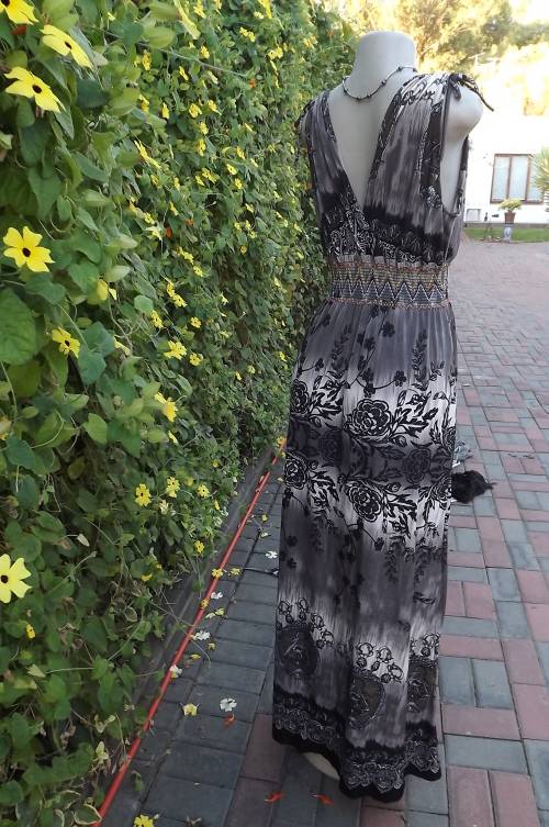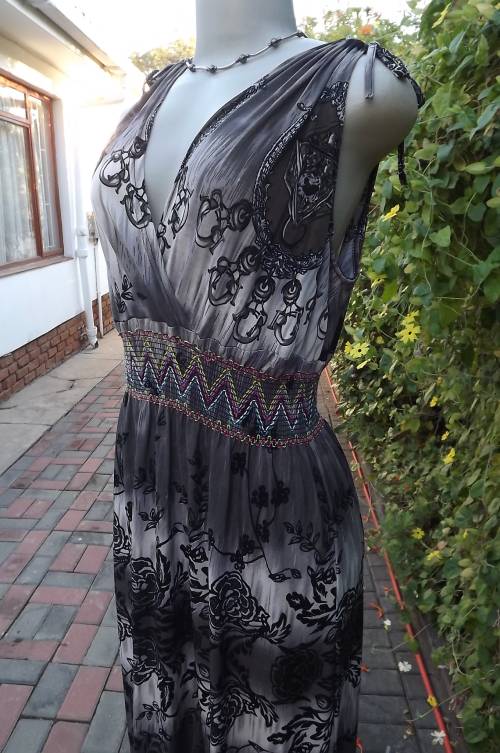 Maxi dress in beige/brown soft polyester in size 36/12.Drawstring on shoulders Crossover front and back bodice. Colourful elasticated middle.Black floral pattern and border on skirt.Used but still in fine condition