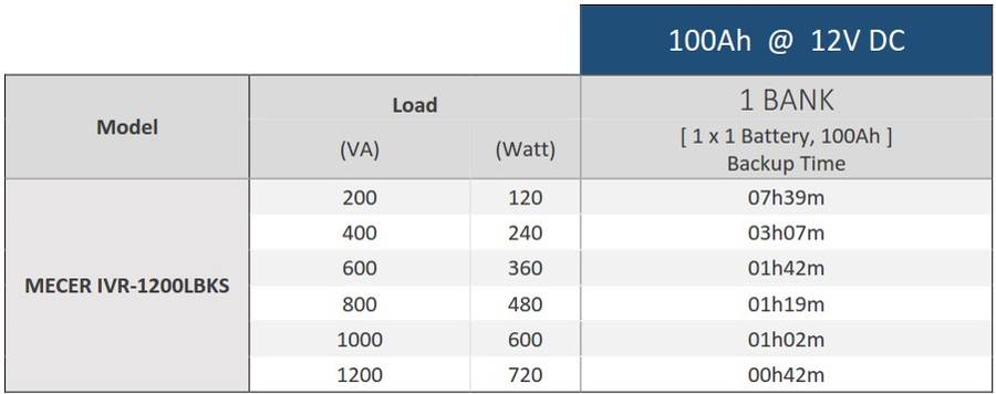 The table below indicates the typical performance of the Mecer 1.2kVA 720W 12V Inverter with 1x 100Ah 12V deep cycle battery (excluded):