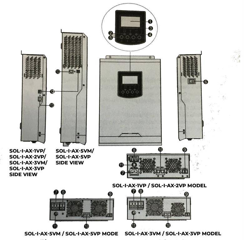 1. LCD display 2. Status indicator 3. Charging indicator 4. Fault indicator 5. Function buttons 6. power on/off switch 7. AC input 8. AC output 9. PV input 10. Battery input 11. Fuse 12. USB communication port 13. R5-232 communication port