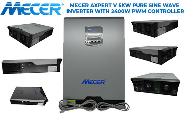Mecer Axpert V 5kW Pure Sine Wave Inverter with 2400W PWM controller - Configurable AC/Solar Input priority via LCD setting, PWM Solar charger Type, 2400W Maximum PV Array power, 105 VDC Maximum PV Array open Circuit voltage, USB & RS-232 communication Port, 48 VDC battery voltage, 10 MS transfer time, Retail Box , 1 year Limited Warranty