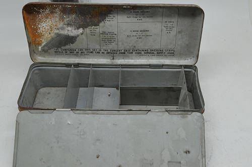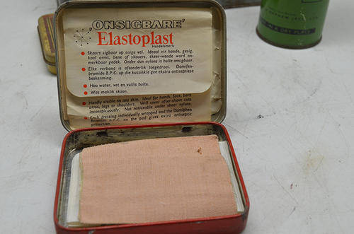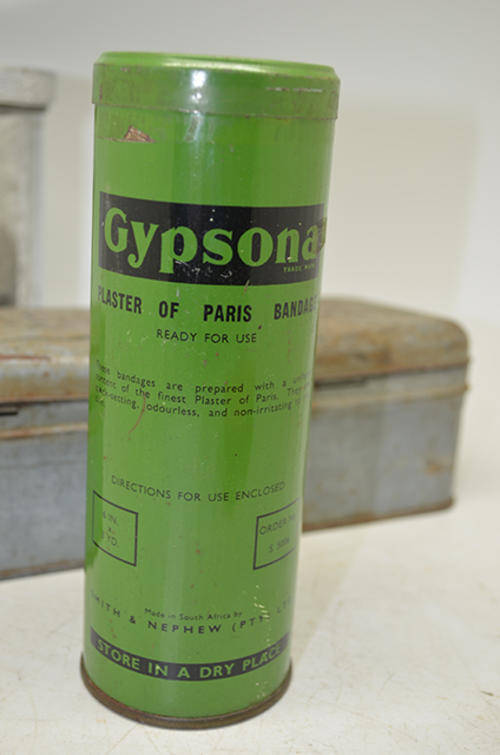 Vintage sterilising unit. 80% of contents are there. 15 cm tall x 9 cm wide. By Thackray Leeds England. Elastoplast First Aid Dressings tin with some contents. 10 cm x 8 cm Elastoplast Emergency Burn Dressings. 10 cm x 8 cm. Tin only. Gypsona Plaster of Paris Bandage Tin. 16cm x 6cm. Tin only Elastoplast Doctors Set Tin. 25 cm 9 cm x 6 cm. Tin only.