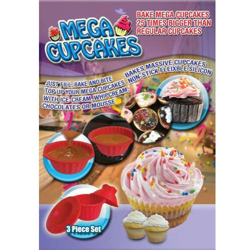 This three-piece silicone Mega Cupcake baking set bakes massive cupcakes, 25-times larger than standard cupcakes!
