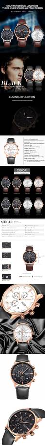 Specification: Item Type: Wrist Watch Dial Window Material Type: Glass Brand Name: MEGIR Water Resistance Depth: 30m (Living Waterproof) Movement: Analog Watch Clasp Type: Needle Buckle Clasp Style: Fashion & Casual Gender: Men Dial Display: Analog Case Shape: Round Band Material Type: Leather Dial Diameter: About 45mm Band Length: About 25cm