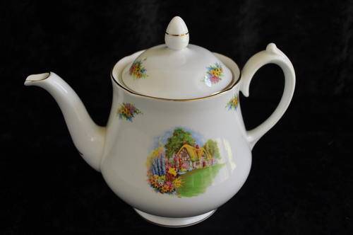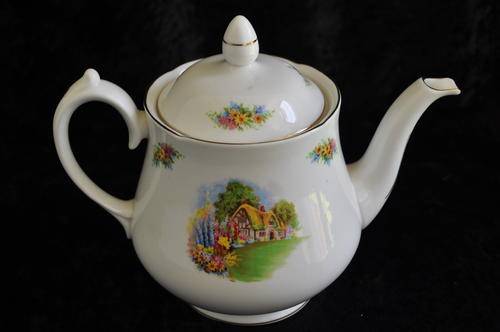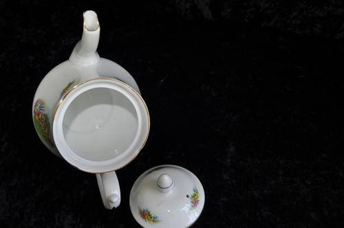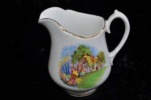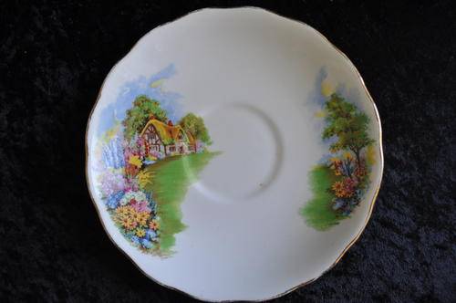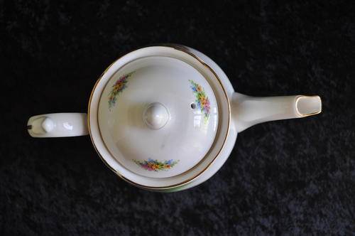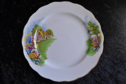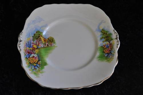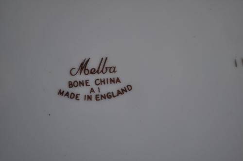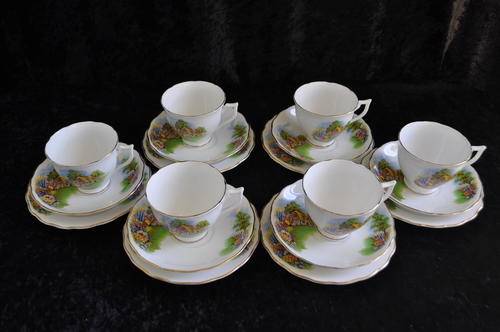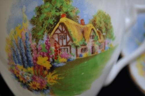 Cups measure 8,5cm in diameter, 7cm in height. Saucers 14cm in diameter. Side plates 16cm in diameter. Milk jug 10cm handle to spout, 110cm in height. Cake plate 23cm handle to handle, 21,5cm across. Tea pot 22cm handle to spout, 17cm in height.
