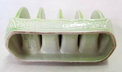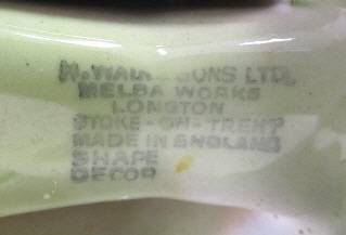 A Melba Ware art deco-style ceramic toast rack made by H. Wain & Sons Ltd (founded in 1946), Melba Works, Longton, Stoke-on-Trent. The mark on the base indicates that the shape is called 'Decor'. Condition good. Width 130 mm; height 80 mm.