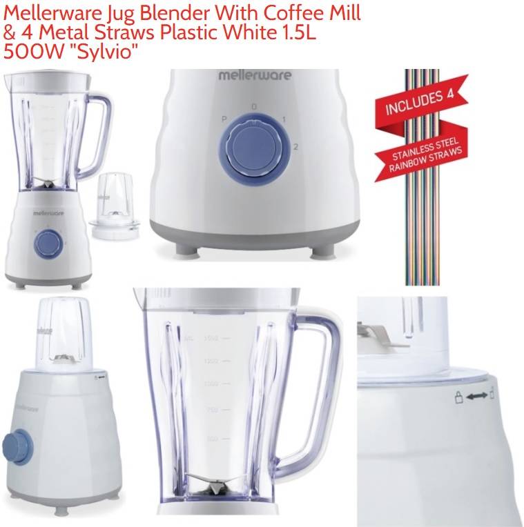 Mellerware Jug Blender With Coffee Mill- 1.5 Litre Plastic Jug, 500w Power, 2x Speed With Pulse Function, Stainless Steel Blades, Includes 4x Metal Straws, Built In Filter, Colour White, Retail Box 1 Year Warranty