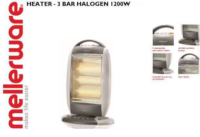 Mellerware 3 Bar Halogen Heater (35400), 3 Heat settings 1200W, Automatic Tip Over Cut Out Protection, Left and right Oscillating Function, Retail Box, 1 year warranty