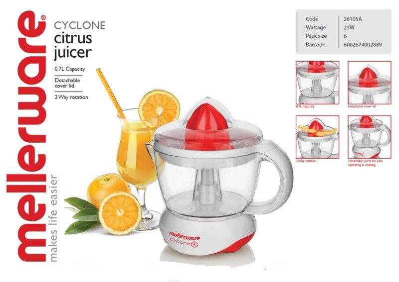 Mellerware Cyclone Citurs Juicer 700ml Retail Box 1 year warranty.
