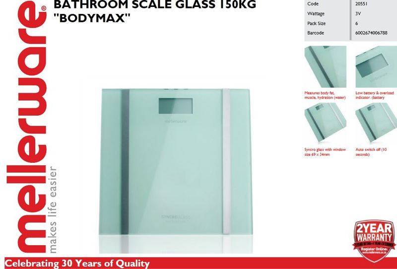 Specifications: Product Code: 20551A Description: Mellerware Glass Bodymax Bathroom Scale 150kg Electronic body fat scale. Weight measurement in kg/lb/st Capacity: 150kg Easy to read digital lcd display Slim design Auto shut off Auto reset Tempered glass platform(30 x 30cm) Overload indication High precision sensors Measures body fat, bone mass, muscle mass and water levels 10 person memory capacity Includes battery