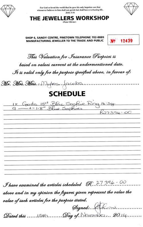 It weighs 14.2 grams and it has nine sapphires in it totaling 1.8 carat. It was bought 43 years ago in Thailand and it comes with a valuation certificate. The ring is 15 carat gold and is a size X. Due to value ring will only be sent by courier and not SA Post.
