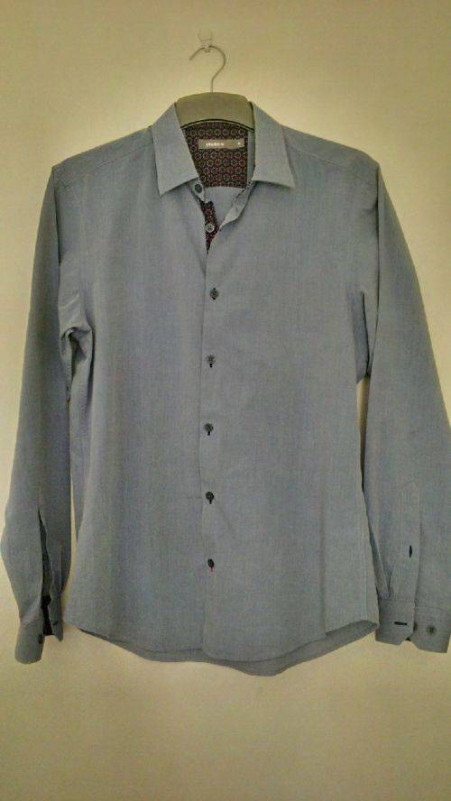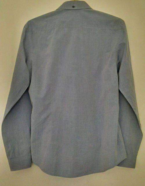 Mens long sleeve blue denim look shirt with nice pattern around buttons and cuffs by Woolworths Studio W in Very good condition