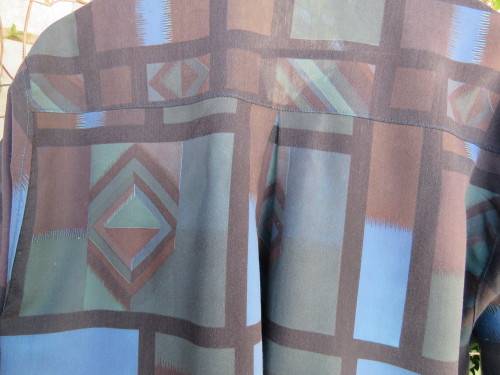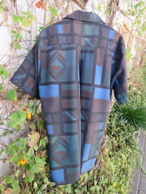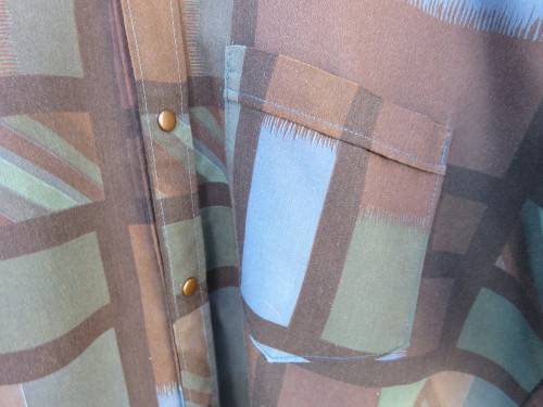 Men's casual short sleeve shirt by 'EL CABITA' in size Large.Chest 115 cm.Close with press buttons on front.One pocket.Yoked back with deep pleat.In dark colour blocks-brown,blue,green and black.In blend of polycotton and viscose.New condition.