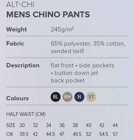 The Mens Chino Pants is a locally manufactured dress wear pants. The flat front chino pants features include side pockets and a button-down back pocket. Great for a corporate office or dress it down with a casual shirt. Available in great colors to suit any style.