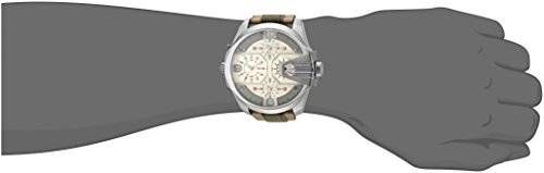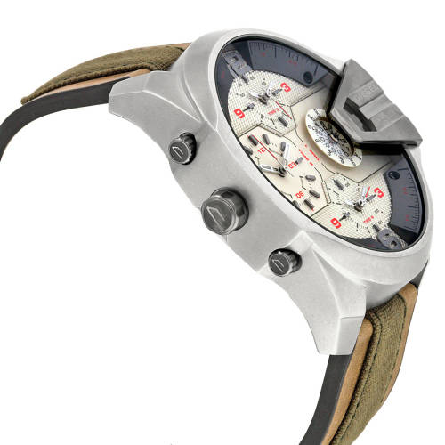 Stainless steel case with a olive green canvas strap (with leather lining). Fixed stainless steel bezel. Champange dial displaying four time zones. Dial Type: Analog. Luminescent hands and markers. Quartz movement. Scratch resistant mineral crystal. Screw down crown. Solid case back. Case dimensions: 55 mm x 62 mm. Case thickness: 12 mm. Round case shape. Band width: 28 mm. Band length: 9 inches. Tang clasp. Water resistant at 100 meters / 330 feet. Functions: hour, minute, second, and 4 time zones. Additional Info: rotating discs indicate time on timezone 1. Casual watch style. Diesel Uber Chief Champange Dial Mens Dual Time Watch DZ7375.