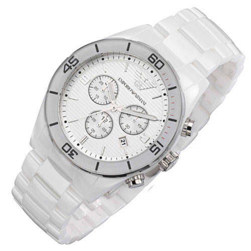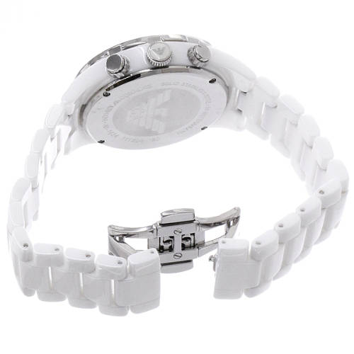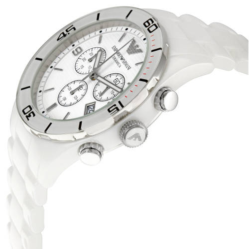 White ceramic case with a white ceramic bracelet. Fixed glass bezel with black markers. White dial with luminous hands and stick hour markers. Arabic numerals mark the 3 and 9 o'clock positions. Minute markers around the outer rim. The Emporio Eagle appears at the 12 o'clock position. Luminescent hands. Date display appears at the 4 o'clock position. Chronograph - three sub-dials displaying: 60 seconds, 30 minutes and 12 hours. Quartz movement. Scratch resistant mineral crystal. Textured crown. Solid case back. Case diameter: 43 mm. Deployment clasp. Water resistant at 30 meters / 100 feet. Emporio Armani White Ceramic Chronograph Mens Watch AR1424.