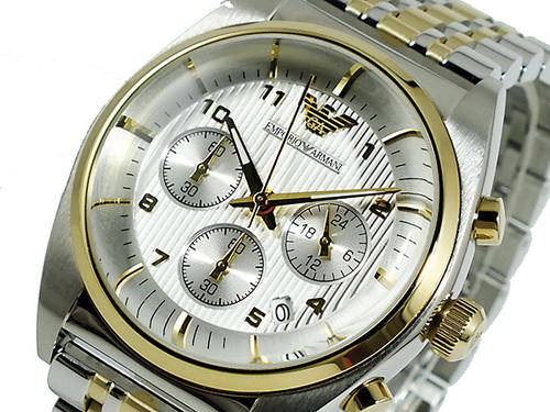 Emporio Armani Gents Silver and Gold Watch AR0396. The Emporio Armani gent’s silver and gold watch AR0396 is a beautiful timepiece from the men’s Emporio Armani Collection. This mans designer watch features a desirable silver with gold stainless steel strap, date display, silver dial with chronograph display and water resistance up to 50 meters. The gents Armani AR0396 watch boasts attention to detail and quality design.